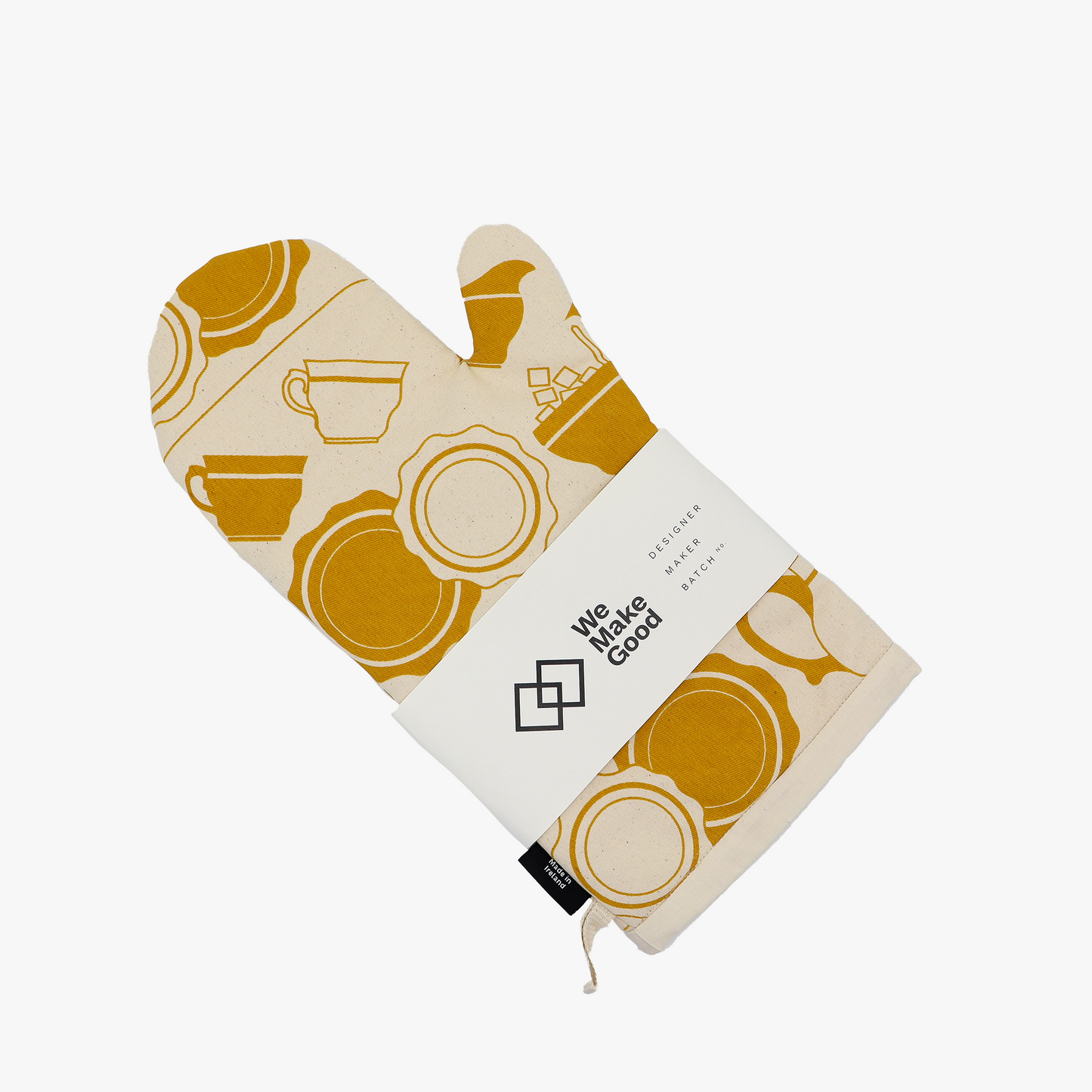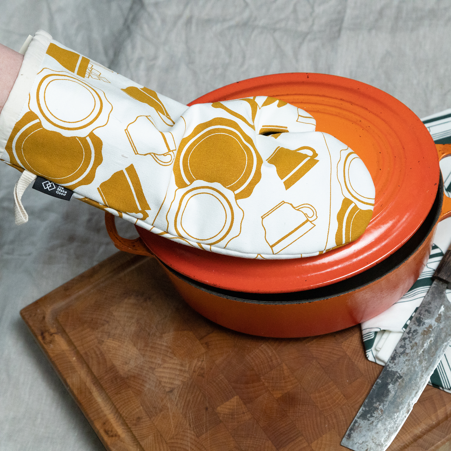 Cook up a storm with this hand-printed oven glove, ensuring safety while in the kitchen. Handmade in Dublin by individuals from marginalised backgrounds, We Make Good Workroom provides skill development opportunities and a sense of belonging. Designed by Laura Buchanan, her art focuses on reflection, nostalgia, and playfulness.